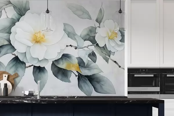 Fototapeter Kameliablomster i akvarellstil på en gren, naturlige farger Nr. w03761