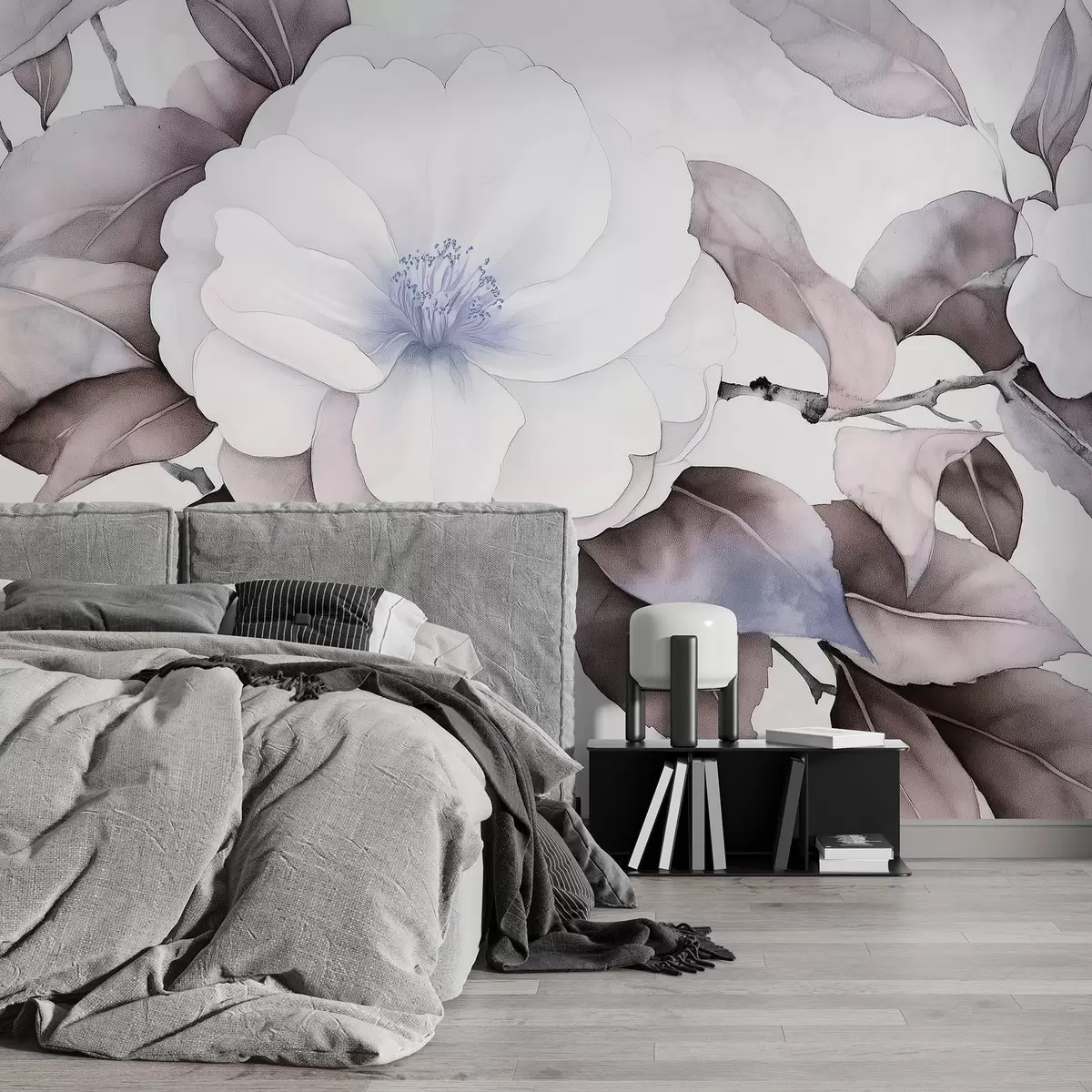 Fototapeter Kameliablomster i akvarellstil på en gren, lilla farger Nr. w03761v1