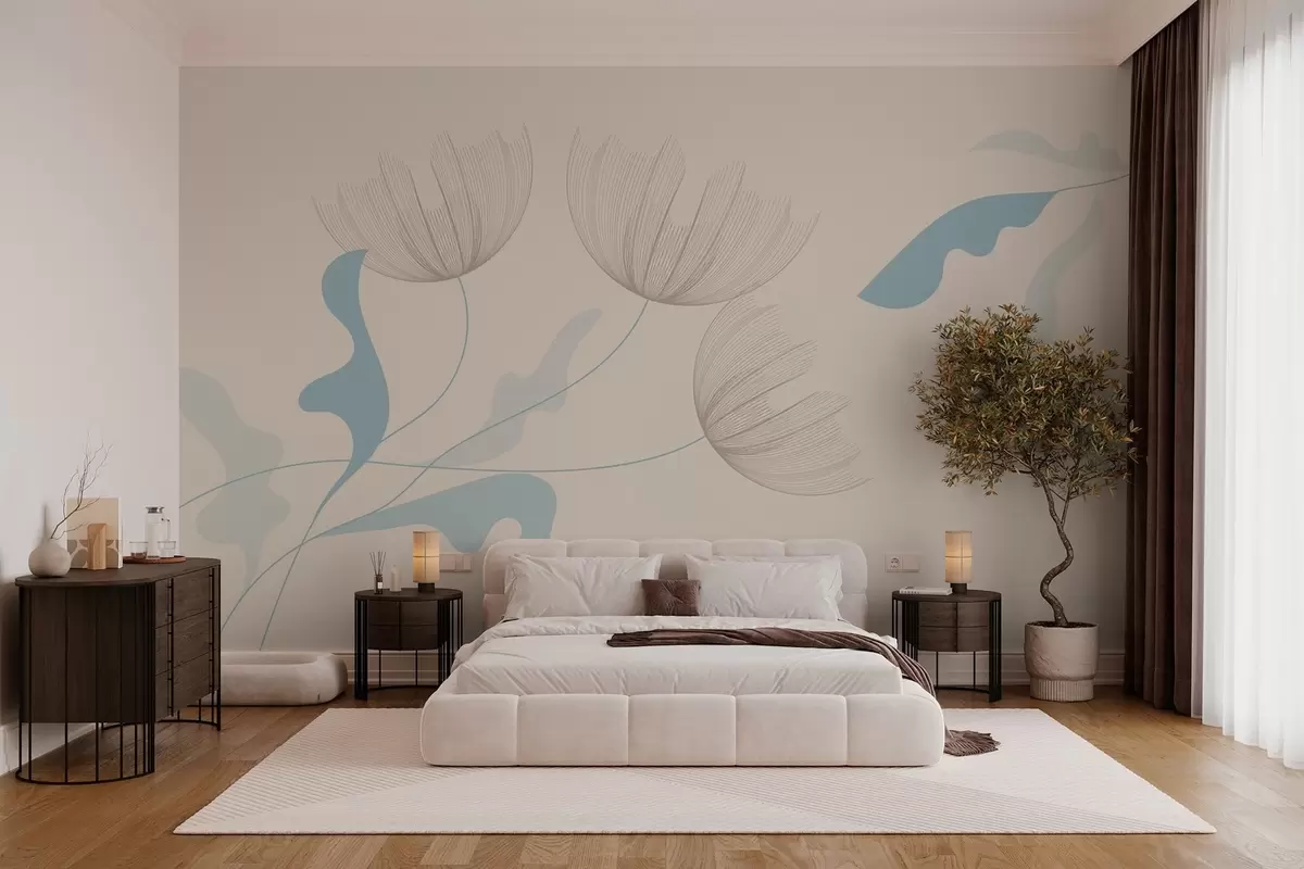 Fototapeter elegante minimalistiske blomster i lyseblå toner på en beige bakgrunn Nr. w03763v1
