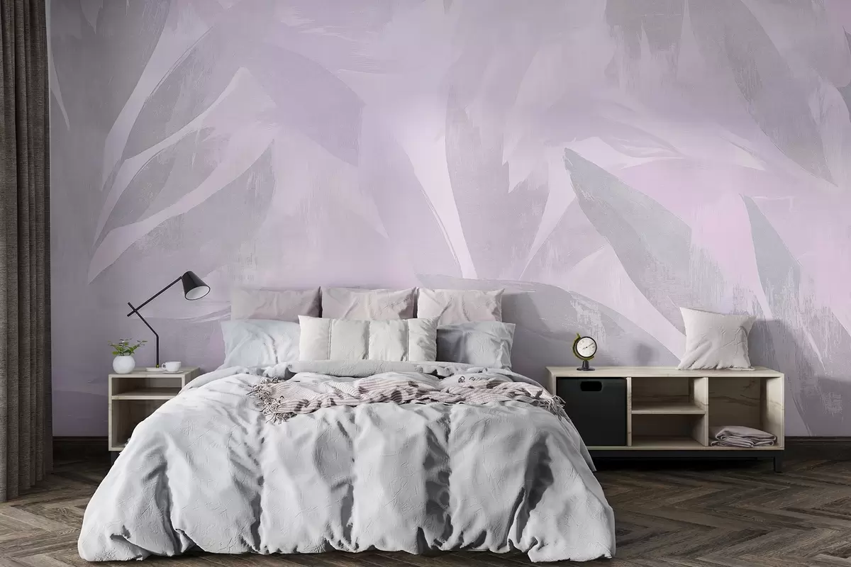 Fototapeter Tropiske blader, blomster, palmer, pastellstil, lilla farger Nr. w03881v1
