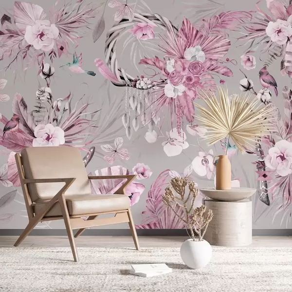 Fototapeter Pynt i boho-stil med pionblomster og fugler, akvarellstil, rosa farger Nr. w03885v1
