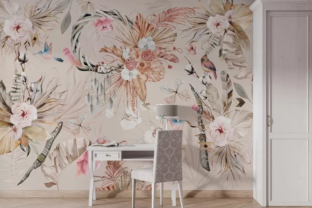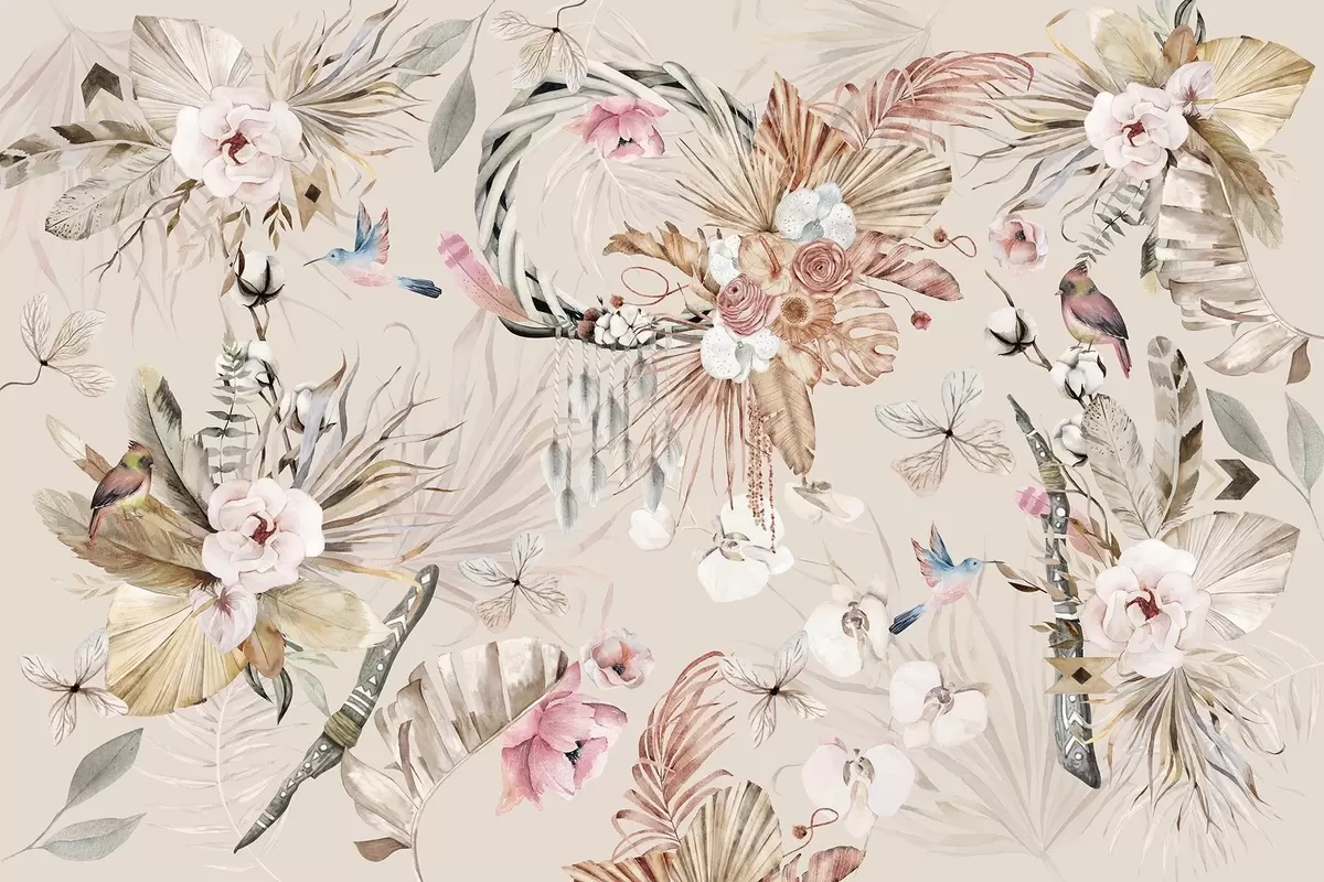 Fototapeter Pynt i boho-stil med pionblomster og fugler, akvarellstil, myke farger Nr. w03885v3