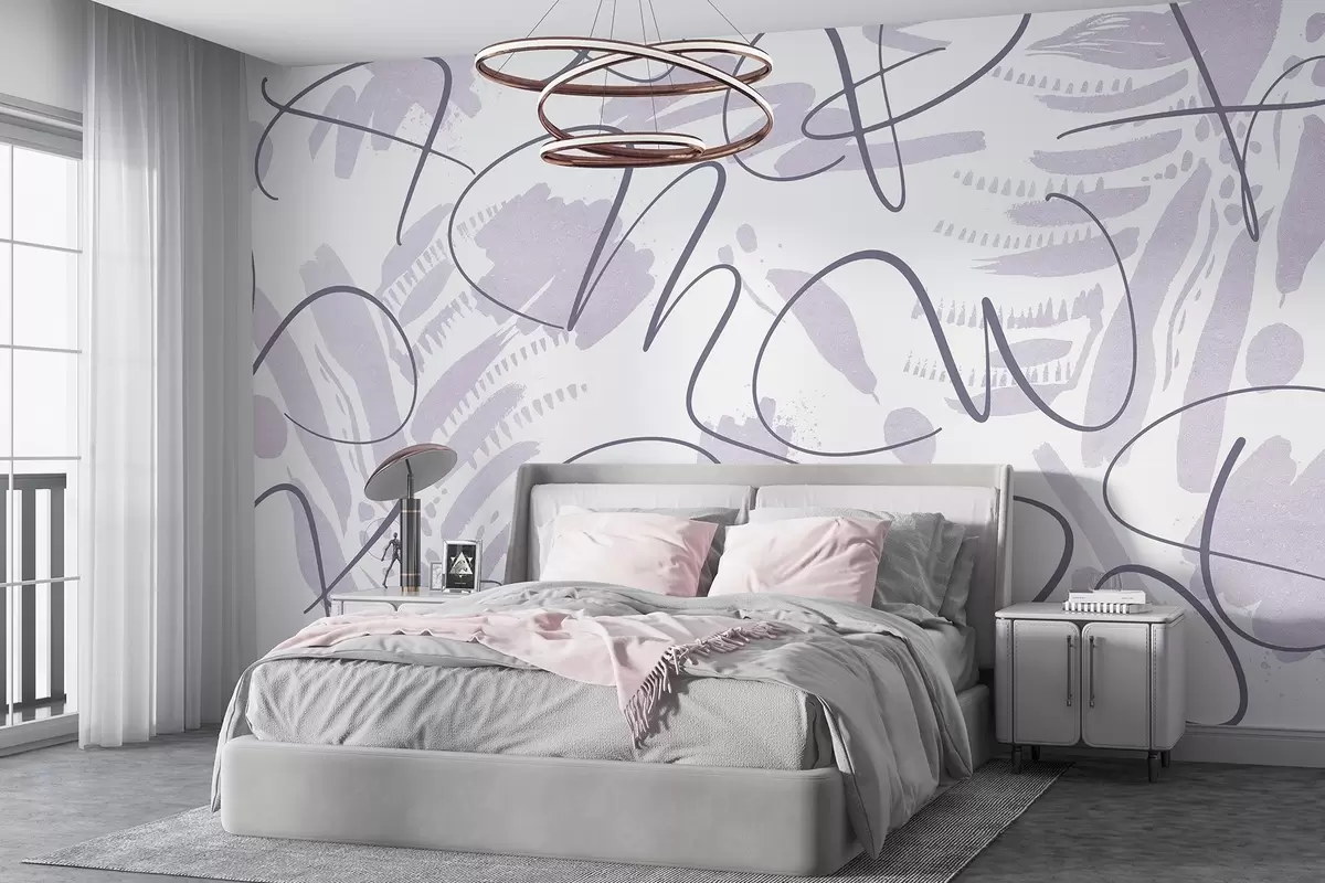 Fototapeter Kalligrafisk abstraksjon med bokstaver, penselstrøk, lilla farge Nr. w03913v2