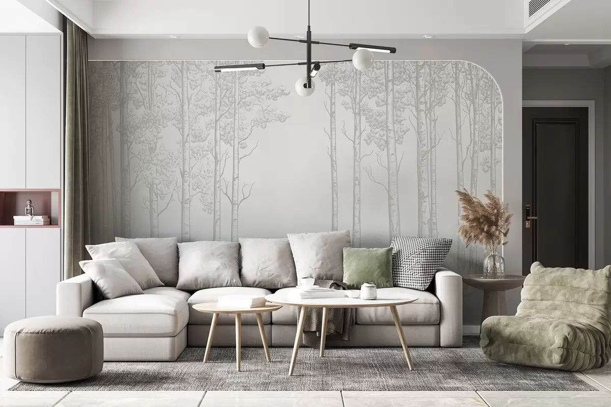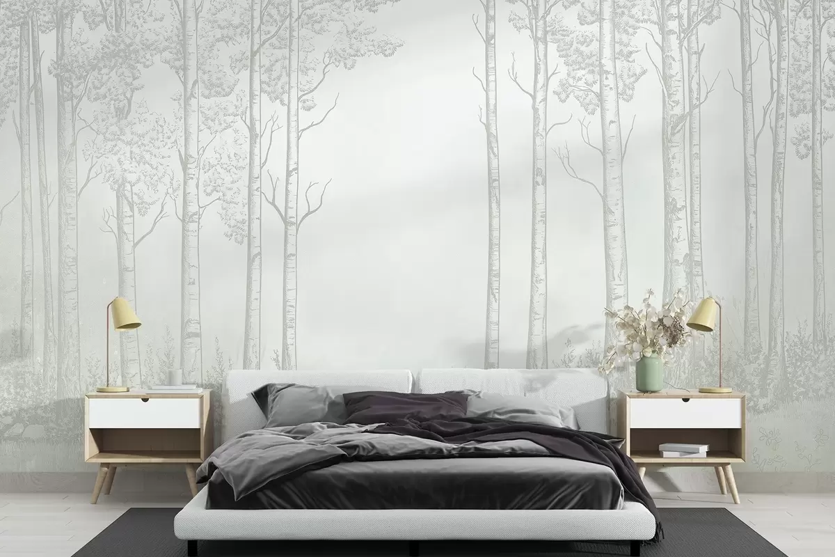 fototapeter Skog med bjørketrær, minimalisme, natur, grønn fargepalett  w04009v1