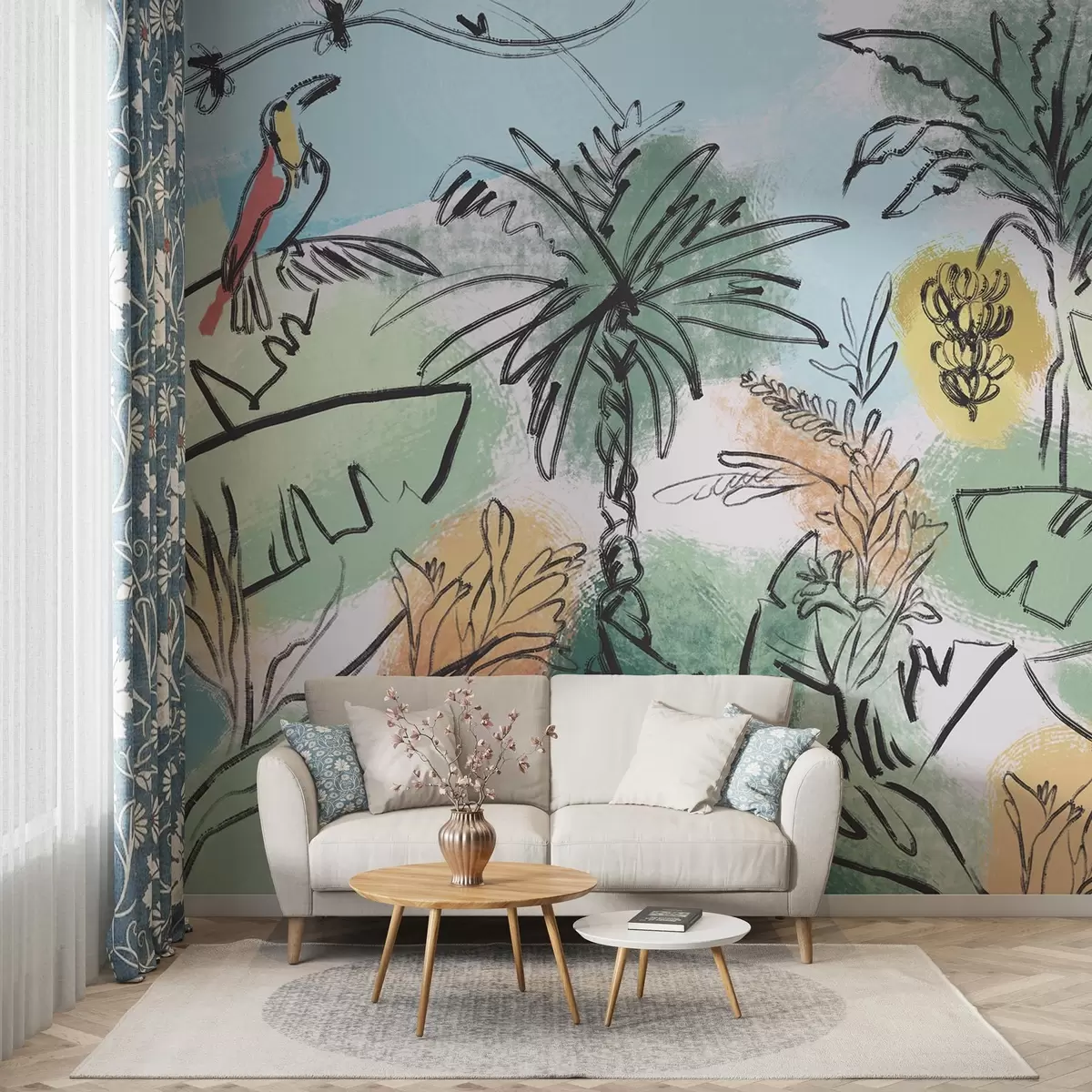 Fototapeter Tropisk trykk med papegøyer, rike farger, tropene Nr. w04019