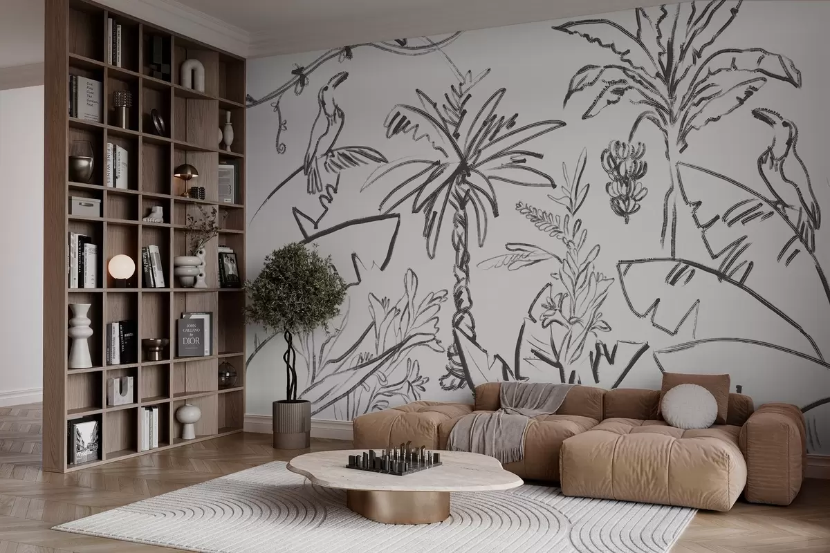 Fototapeter Tropisk strektegning, bananer, palmer, konturgrafikk Nr. w04020