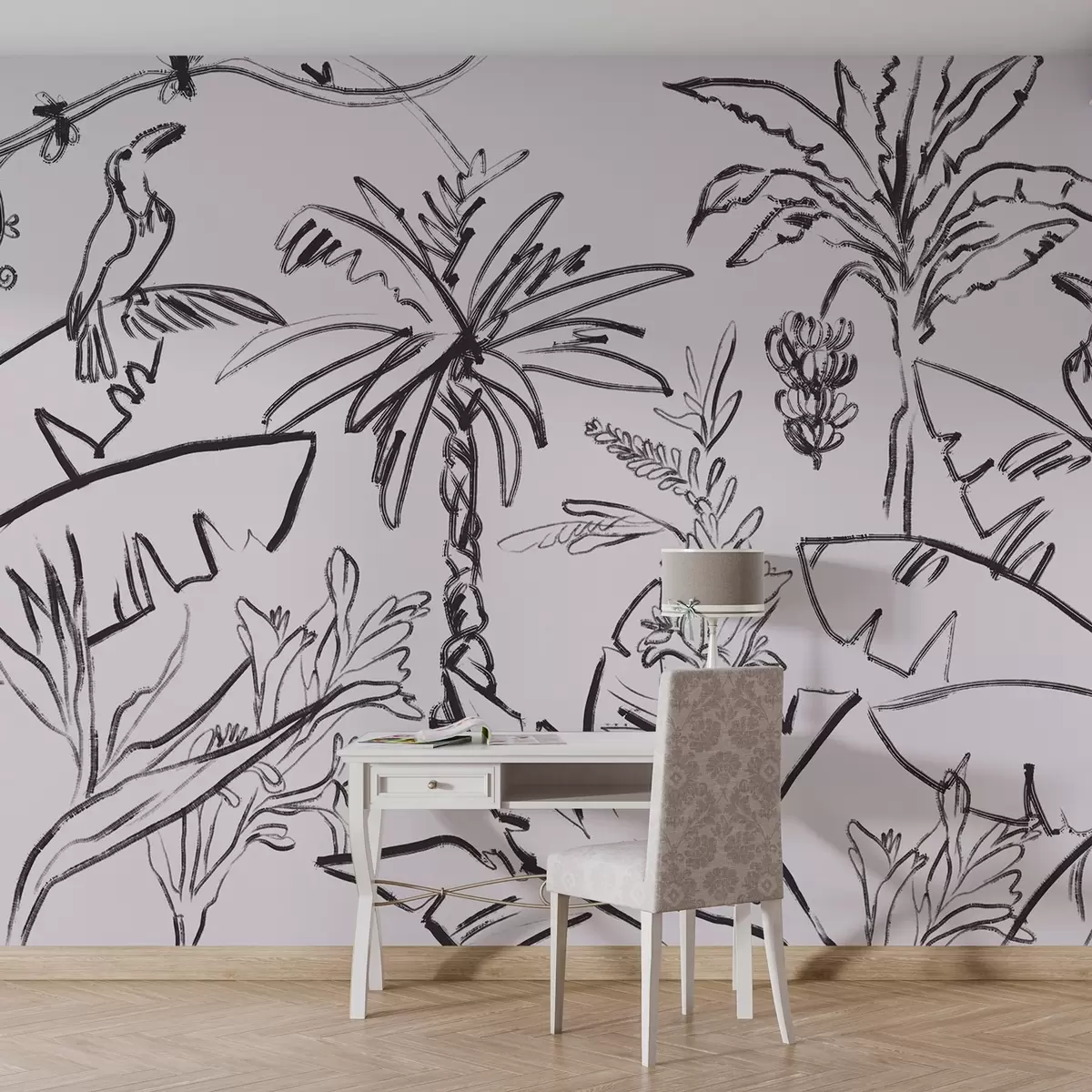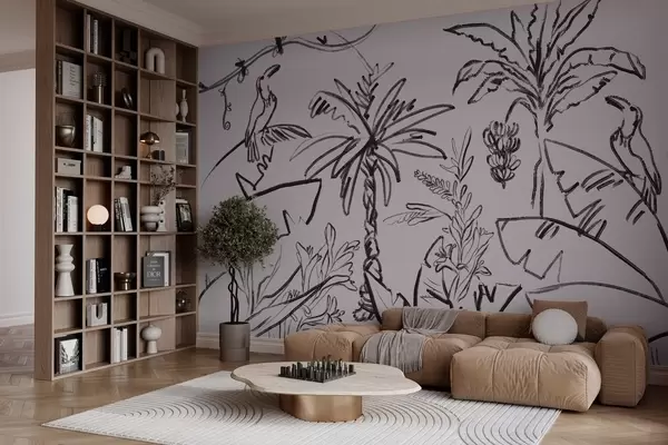 Fototapeter Tropisk mønster i svart farge, palmer, bananer, konturgrafikk Nr. w04020v7