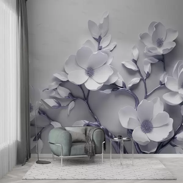 Fototapeter Dimensjonalt blomstermønster i myke hvite og fiolettgrå toner Nr. w04039v1