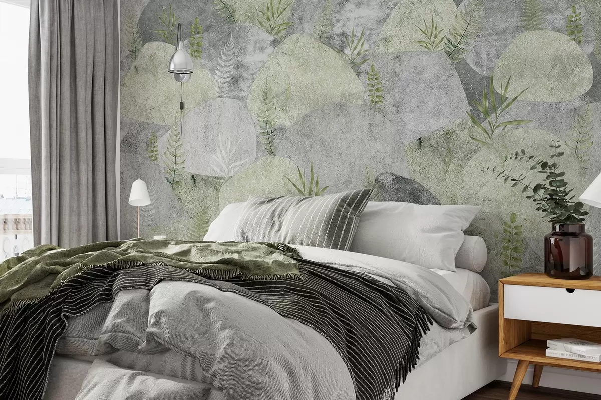 Fototapeter Steiner med planter, bregner, nordisk, rustikk stil, grå og grønne farger Nr. w04064v2