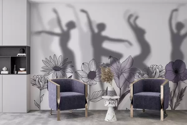 Fototapeter Ballerinasilhuetter, rustikke blomster, streker, grå og lilla farger Nr. w04069v2