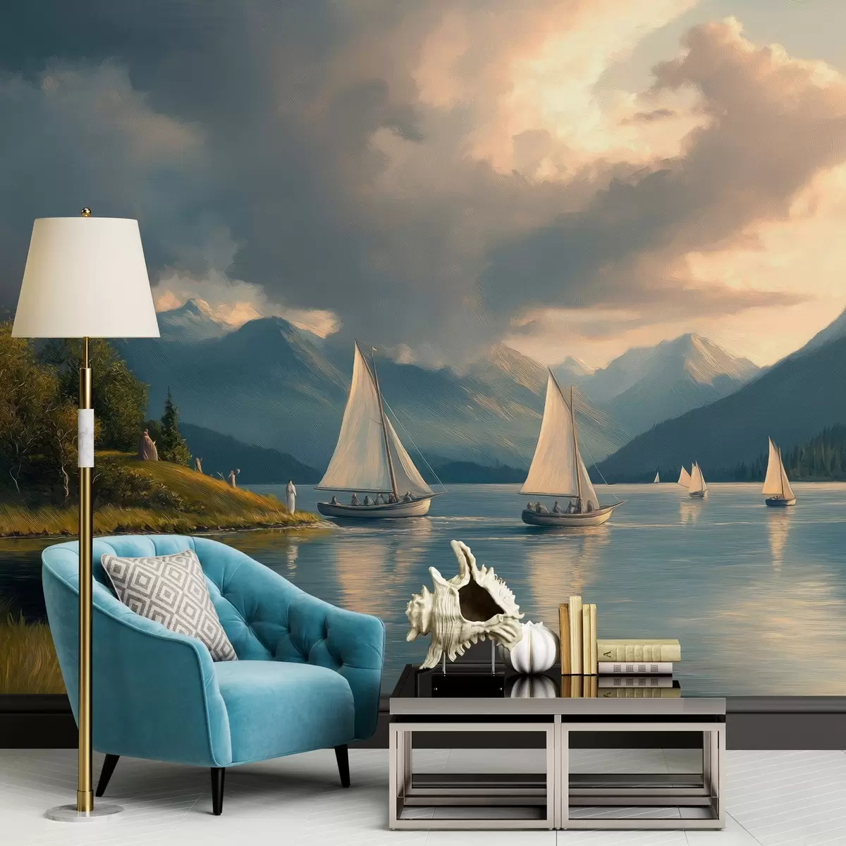 Fototapeter regatta på en innsjø med overskyet himmel i stil med et oljemaleri fra 1800-tallet Nr. w04076