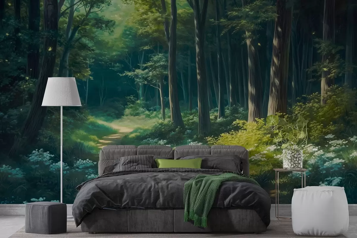 Fototapeter Grønn skog med mildt sollys, trær og hvite blomster, oljetegning Nr. w04118