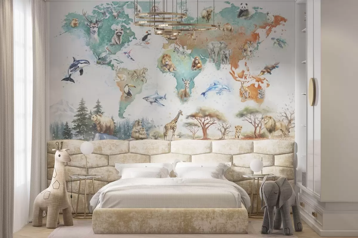Fototapeter Verdenskart med dyr, pedagogisk illustrasjonsstil for barn Nr. w04148