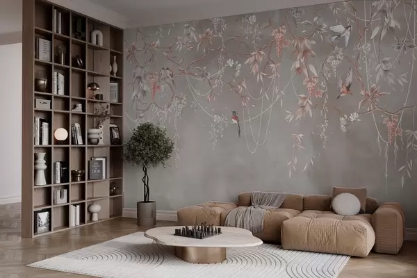 Fototapeter Grener med druer og fugler på varm, grårosa bakgrunn Nr. w04302