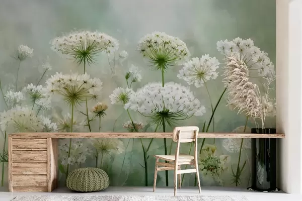 Fototapeter delikate hvite villblomster Queen Anne, i en pittoresk stil, grønne toner Nr. w04313
