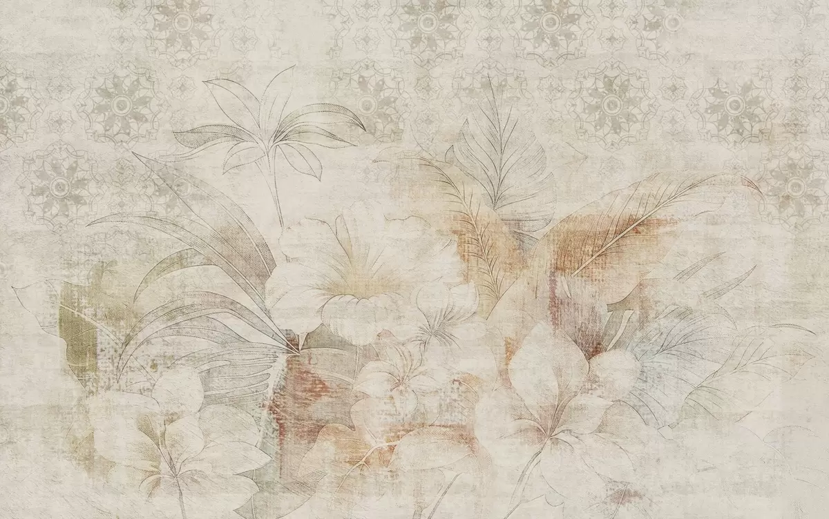 Fototapeter Blomster og blader på strukturert bakgrunn med ornamenter Nr. w04343