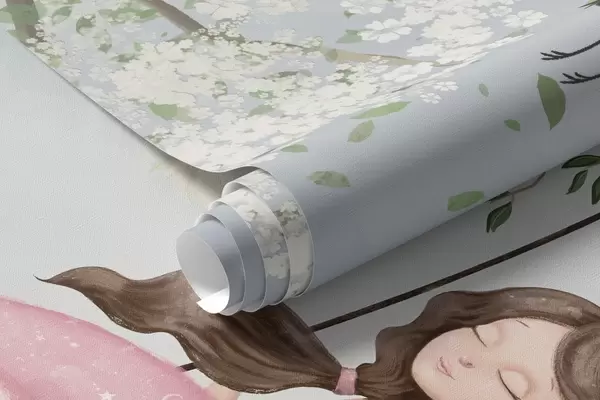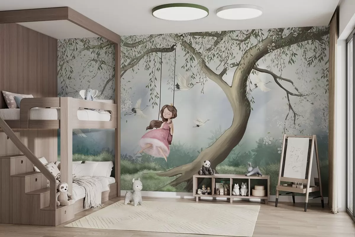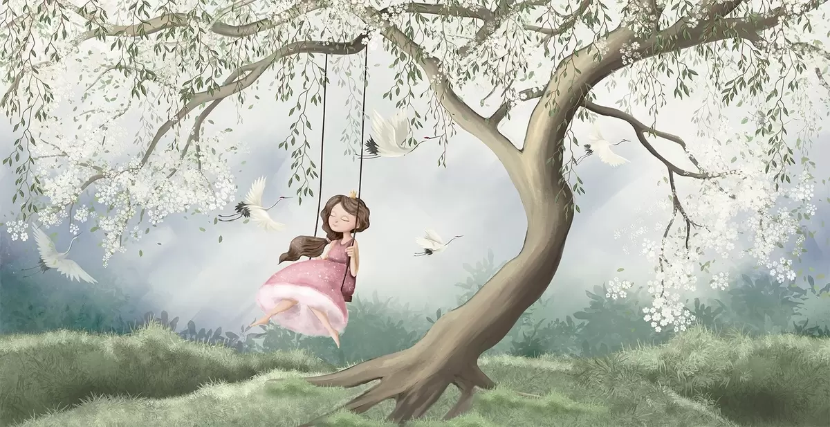 Fototapeter Jente på huske under et blomstrende tre med fugler som flyr rundt Nr. w04370