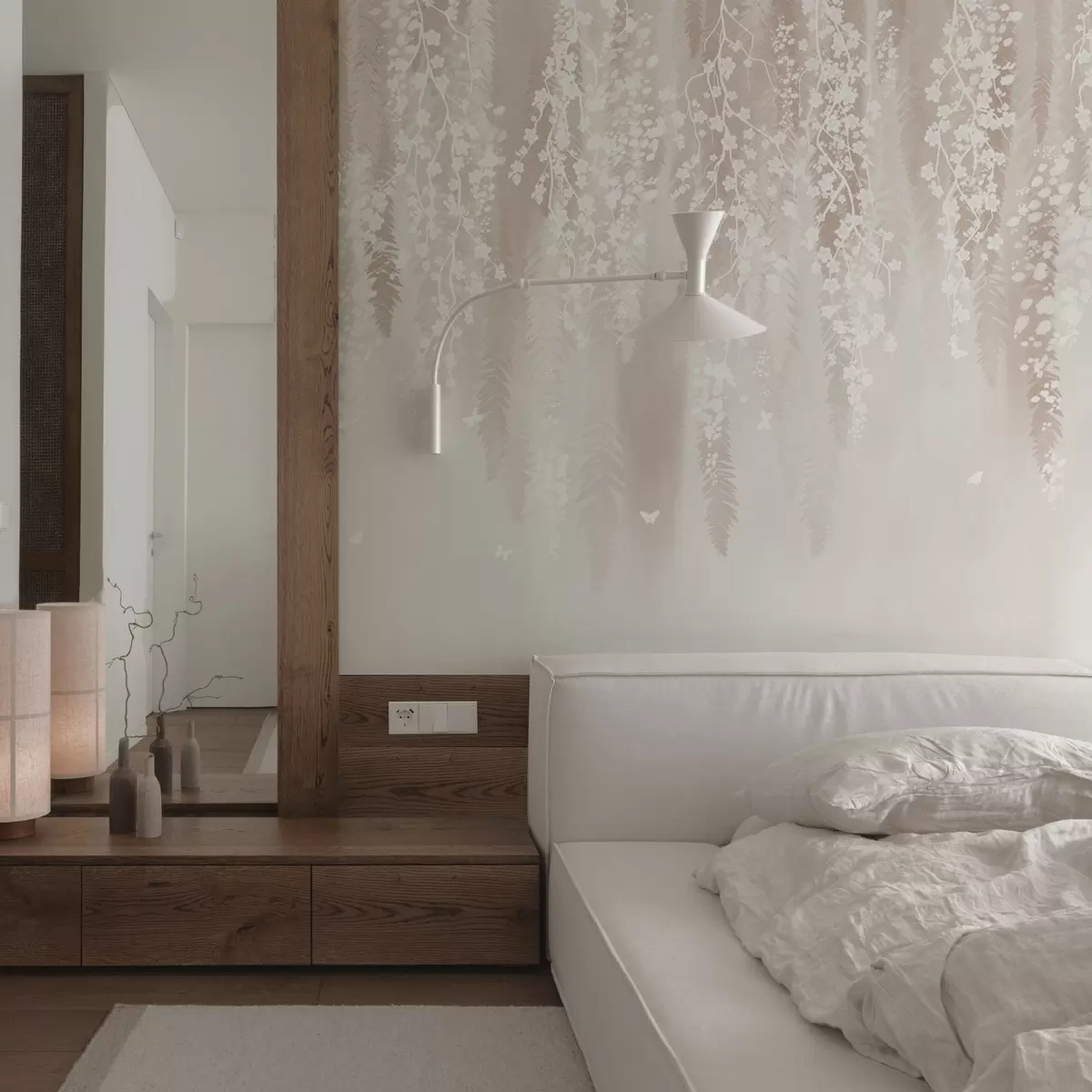 Fototapeter Lyse grener med hvite blomster på en mild bakgrunn Nr. w04417