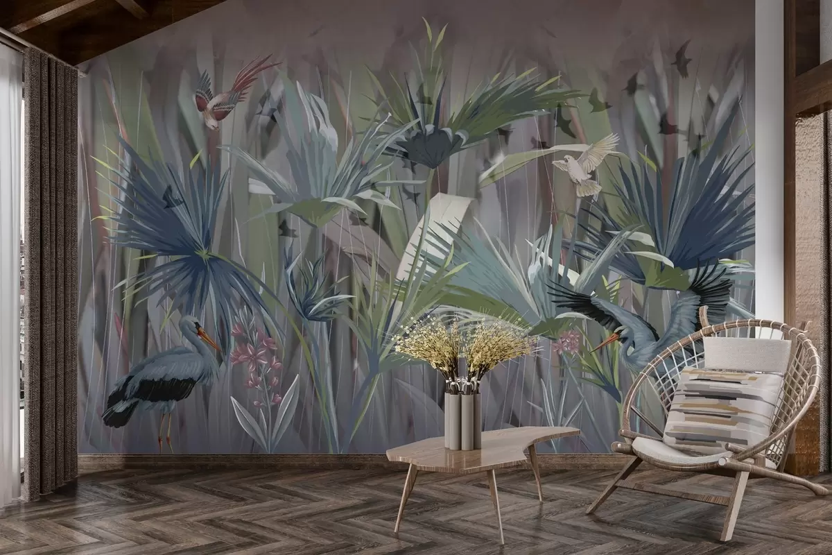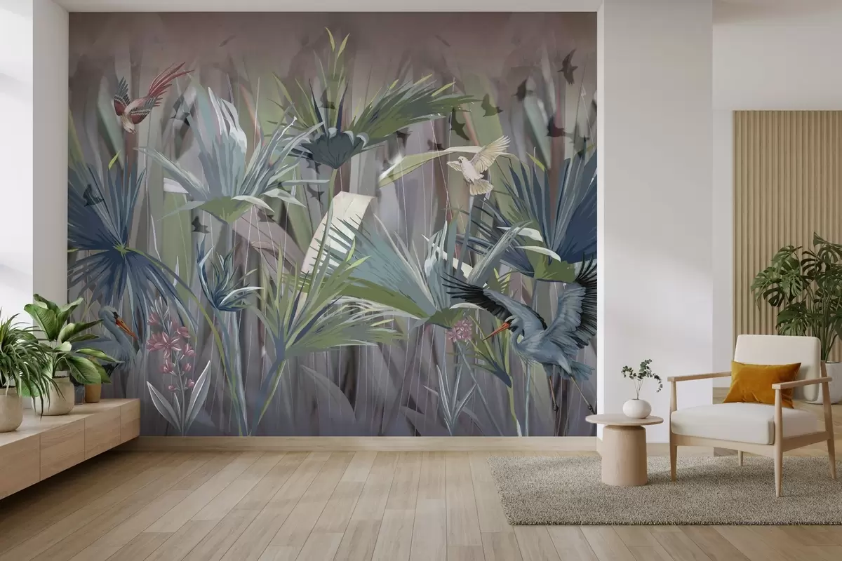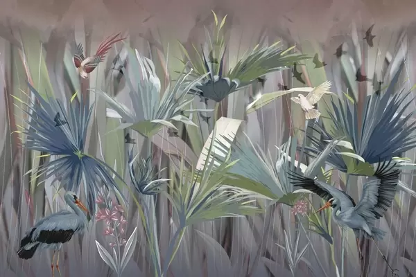 Fototapeter Eksotiske fugler blant palmeblader og blomster Nr. w04458