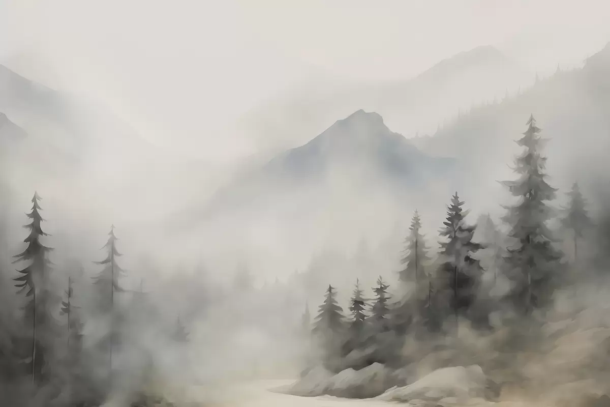Fototapeter Skog i tåken med fjellene i bakgrunnen Nr. w04493
