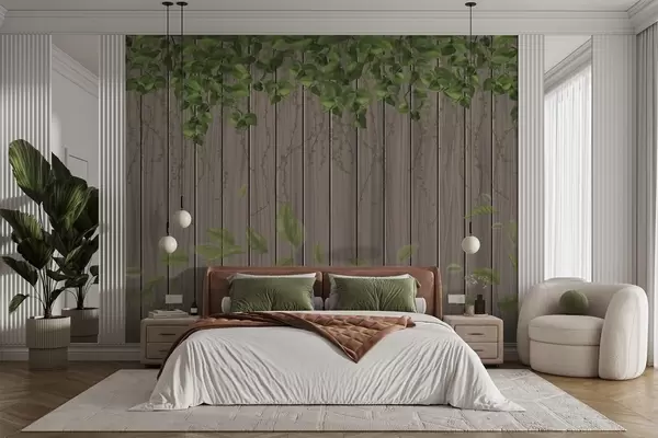 Fototapeter Imitasjon av treplanker med hengende blader Nr. w04603