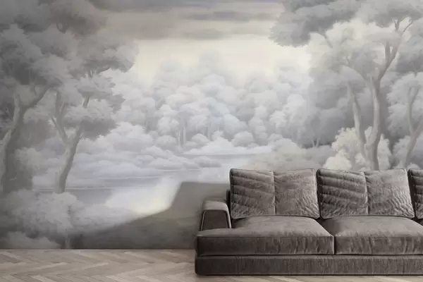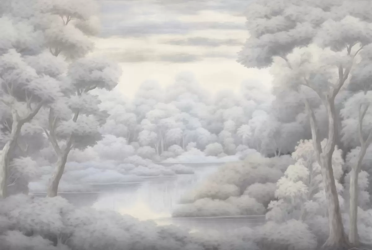 Fototapeter Tåkete skog og innsjø i myke gråtoner Nr. w04617
