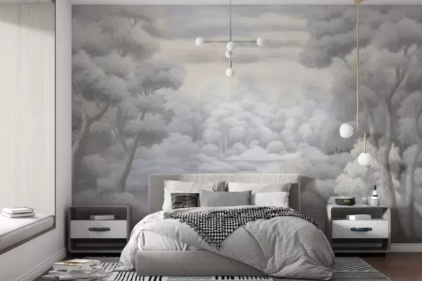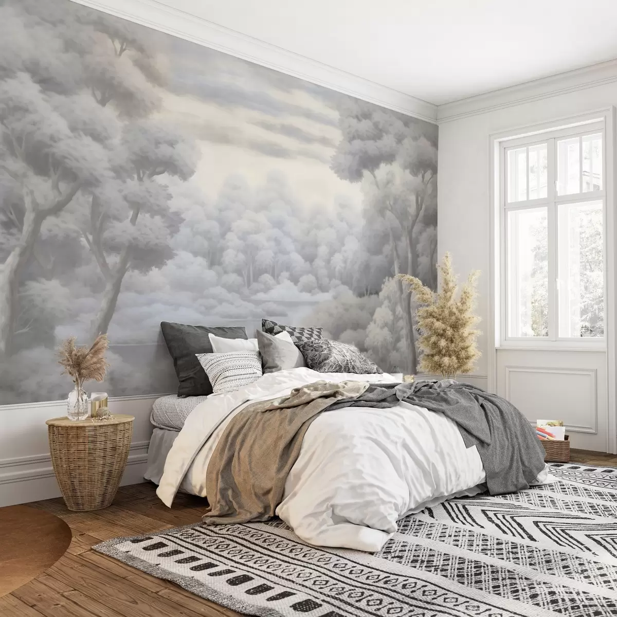 Fototapeter Tåkete skog og innsjø i myke gråtoner Nr. w04617