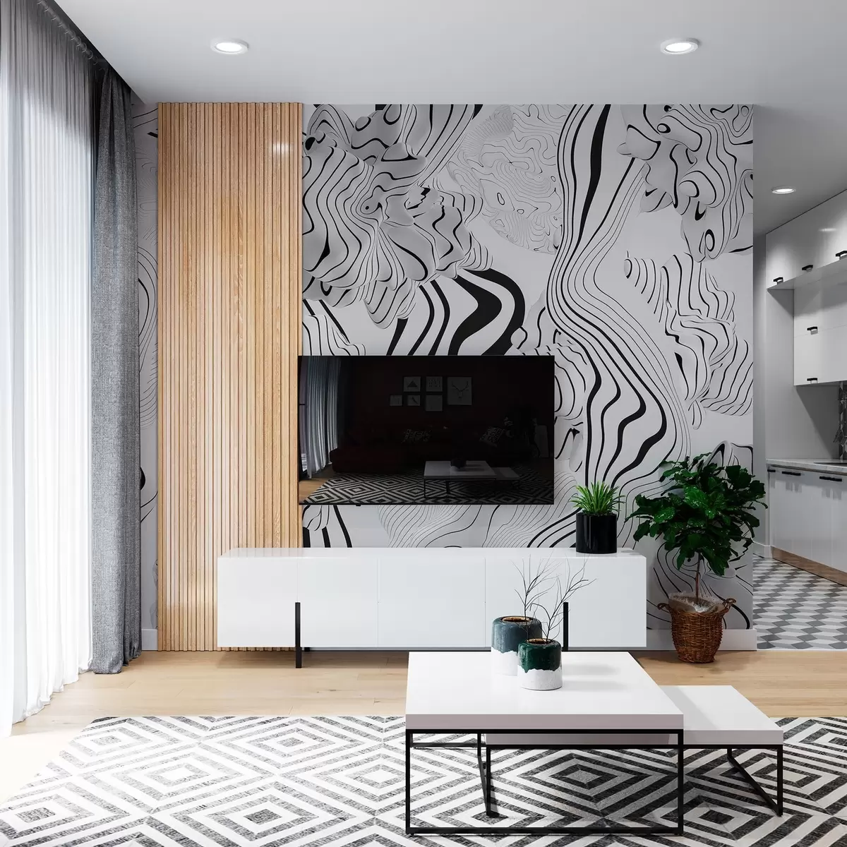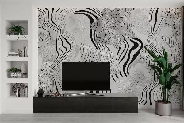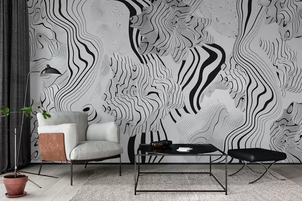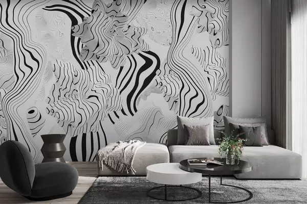 fototapeter abstrakte organiske former i 3D-stil i hvite og grå toner med svarte striper w04627