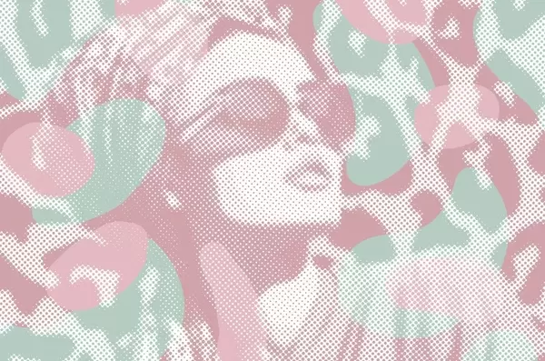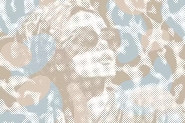 Fototapeter portrett av en kvinne på en leopardbakgrunn i en prikkete stil i beige og blå toner Nr. w04630