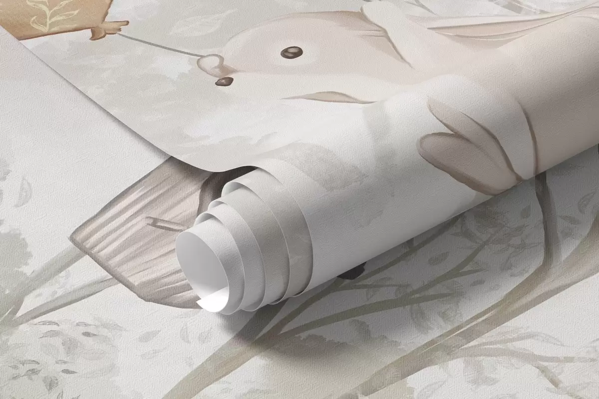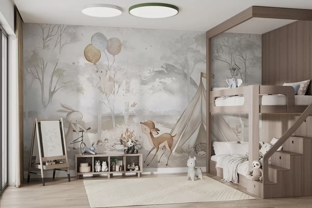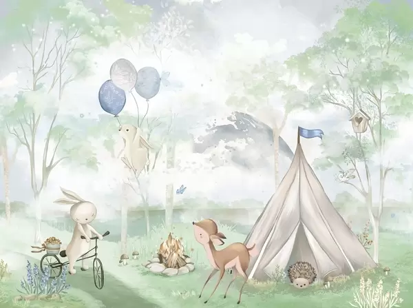 Fototapeter Barnecamp i varme beigefarger, telt og skogsdyr Nr. w04671