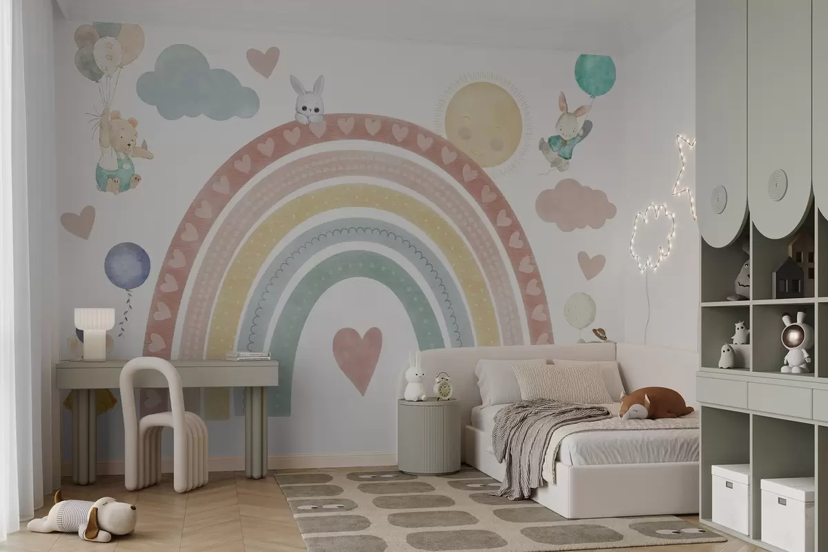 Fototapeter Pastellregnbue med hjerter, dyr og ballonger Nr. w04681