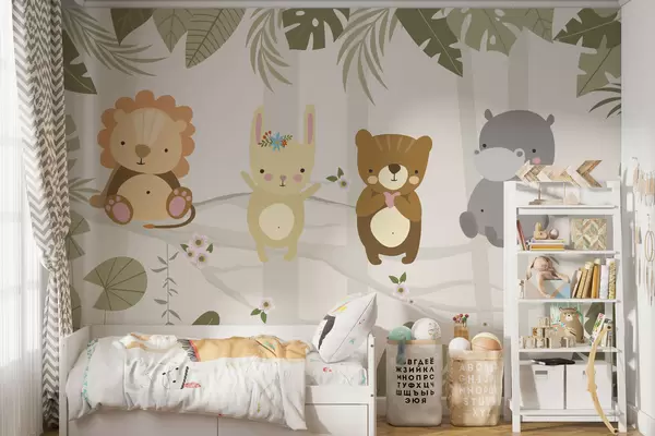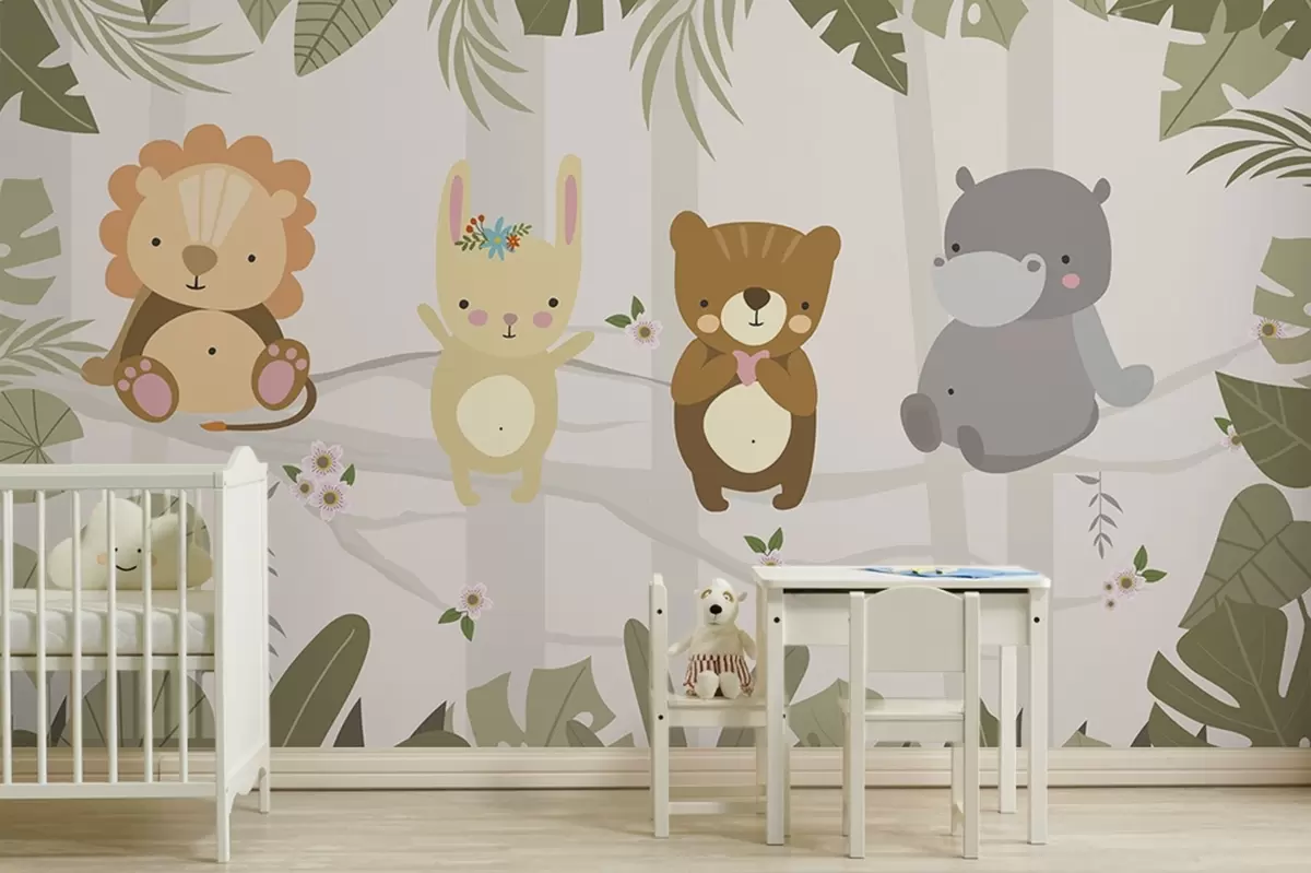 Fototapeter Søt løve, kanin, bjørn og flodhest blant bladene Nr. w04682