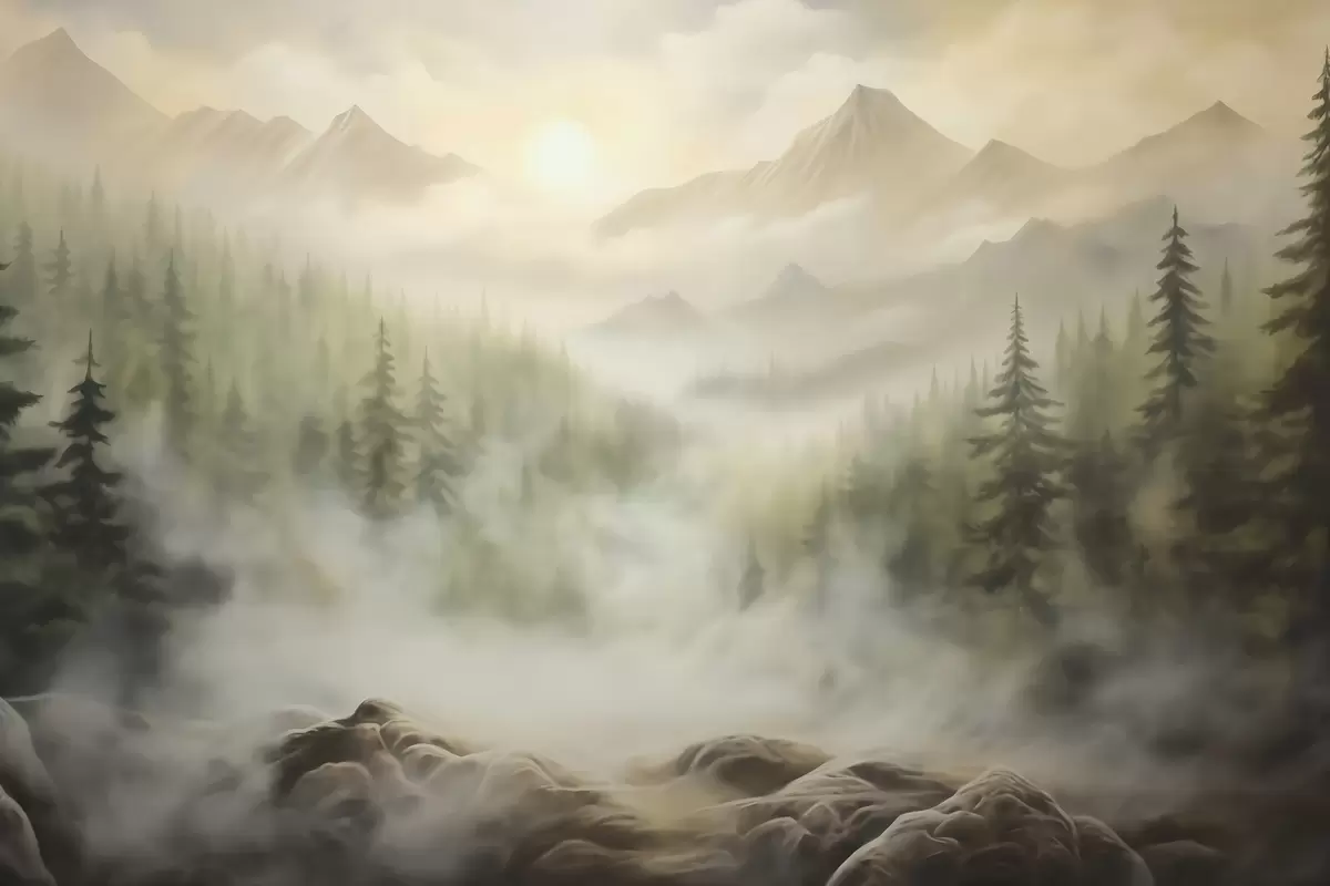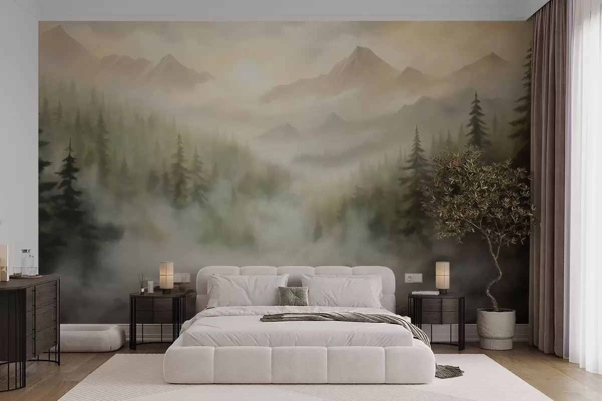 Fototapeter Skog i tåken med fjellene i bakgrunnen Nr. w04730