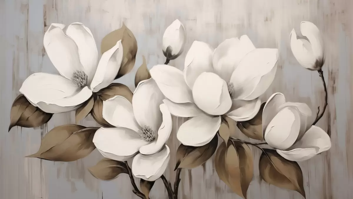 Fototapeter Store magnoliablomster med taupefargede blader på børstet bakgrunn Nr. w04785