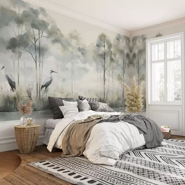 Fototapeter Tåkete skog ved vannet med hegrer, myk, kjølig fargepalett Nr. w04788