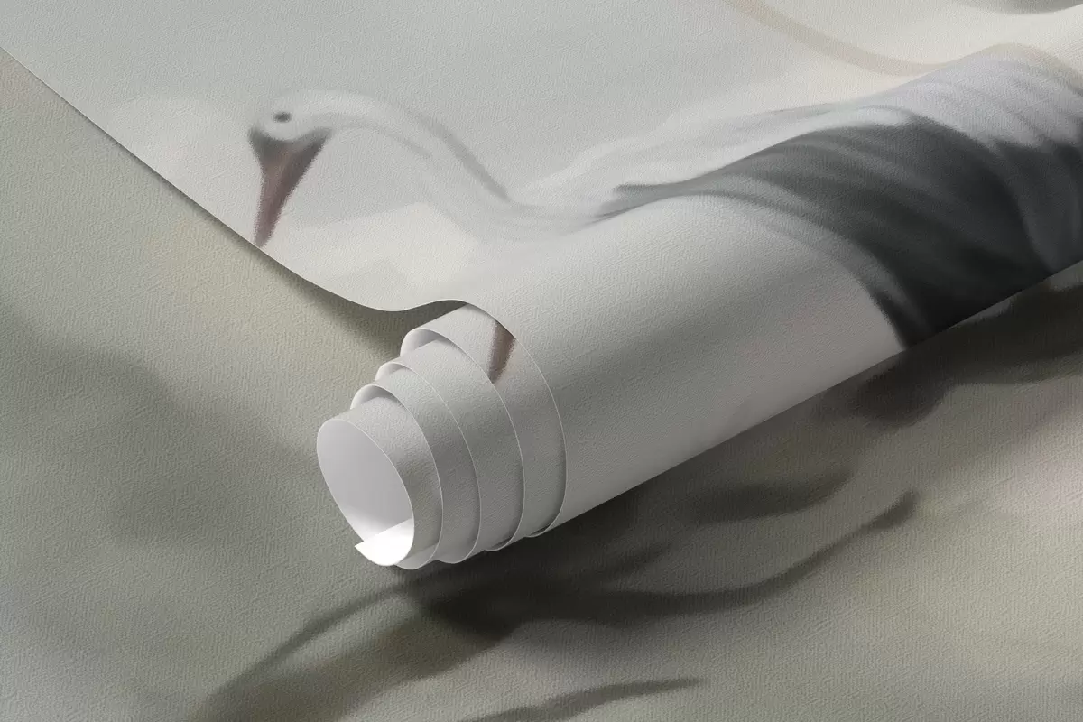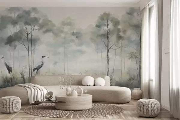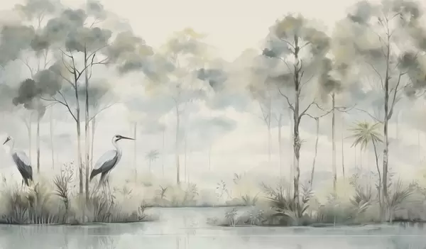 Fototapeter Tåkete skog ved vannet med hegrer, myk, kjølig fargepalett Nr. w04788