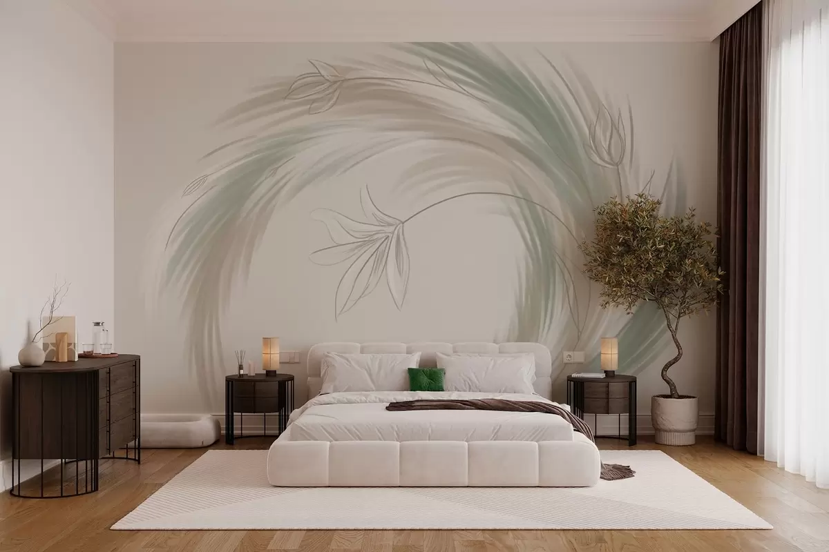 Fototapeter grønne og beige fjær og blomster, håndmalt Nr. w04816