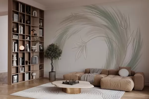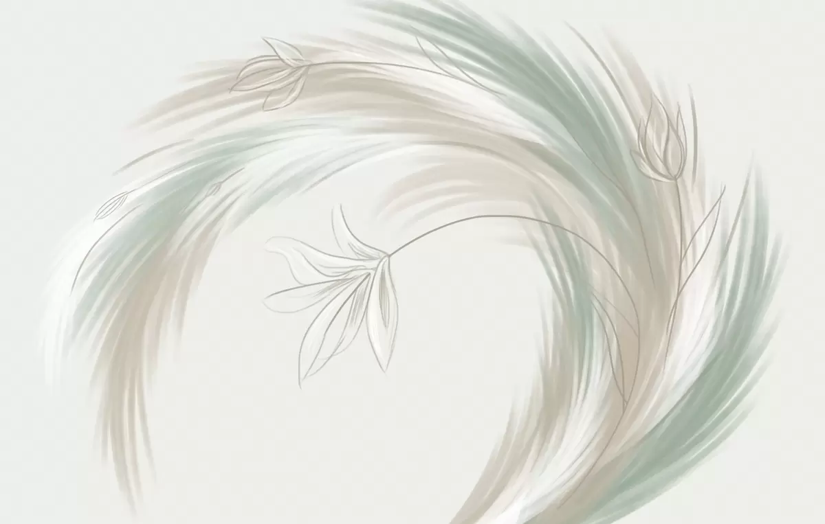 Fototapeter grønne og beige fjær og blomster, håndmalt Nr. w04816