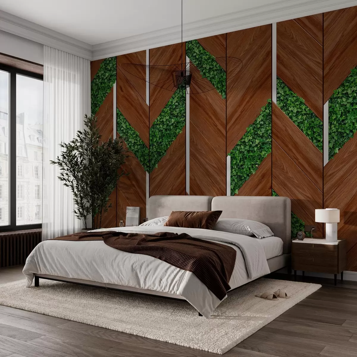 Fototapeter imitasjon av mørke trepaneler med planteinnlegg Nr. w04875v1