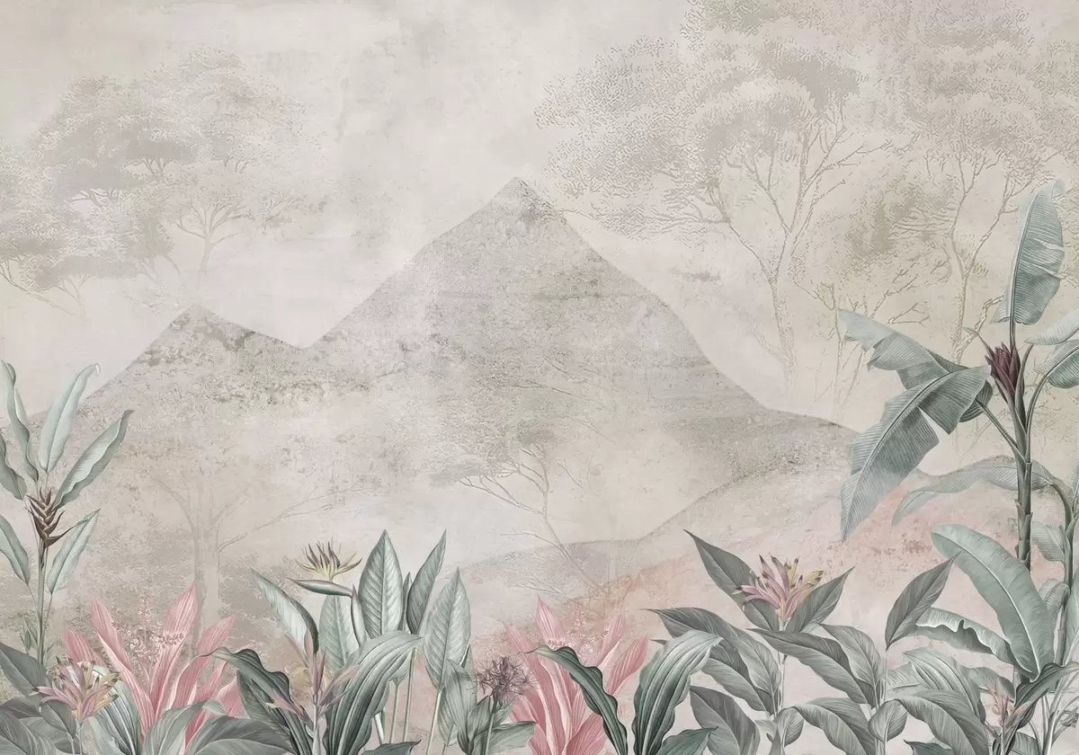 Fototapeter Pastellfargede bananblader og tropiske blomster mot fjellene Nr. w04933