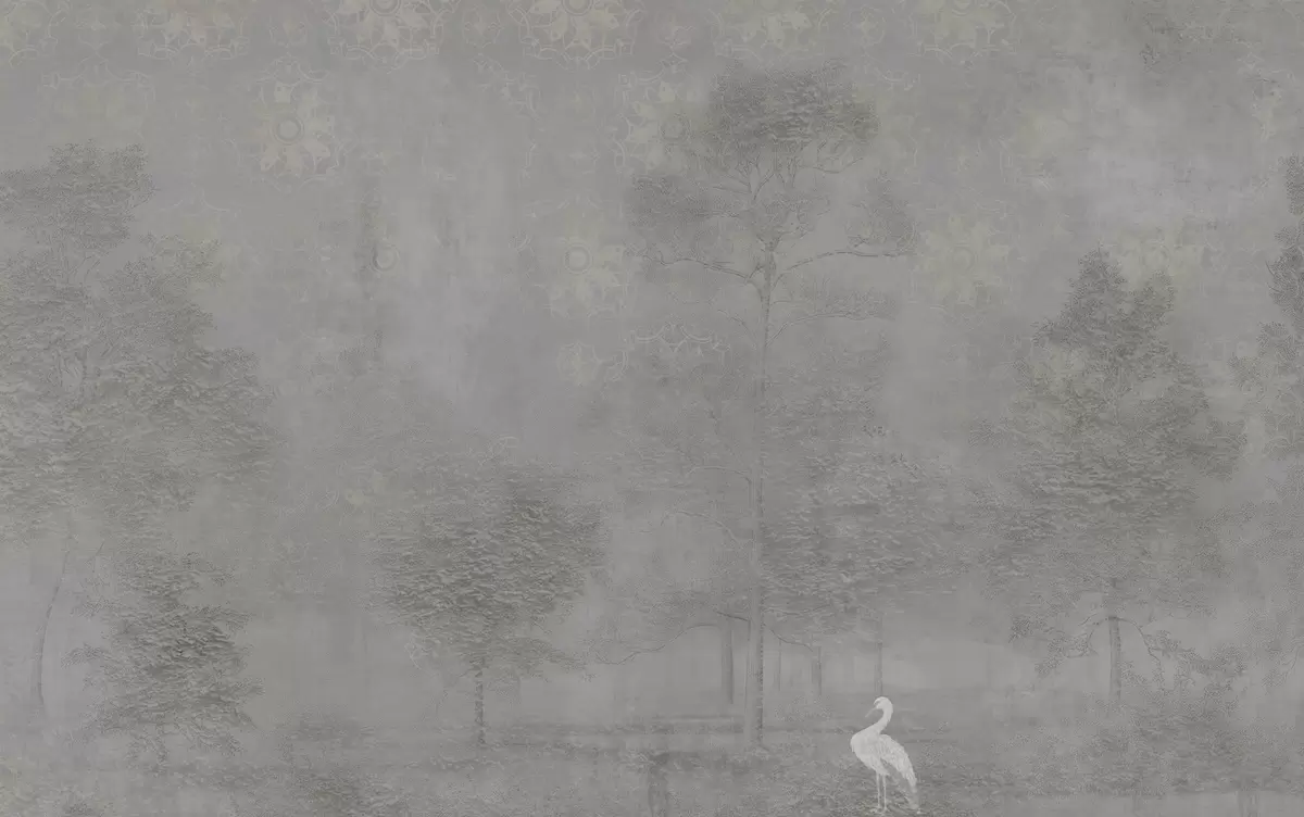Fototapeter Lys, tåkete skog med en hegre i kule gråtoner Nr. w04953v2