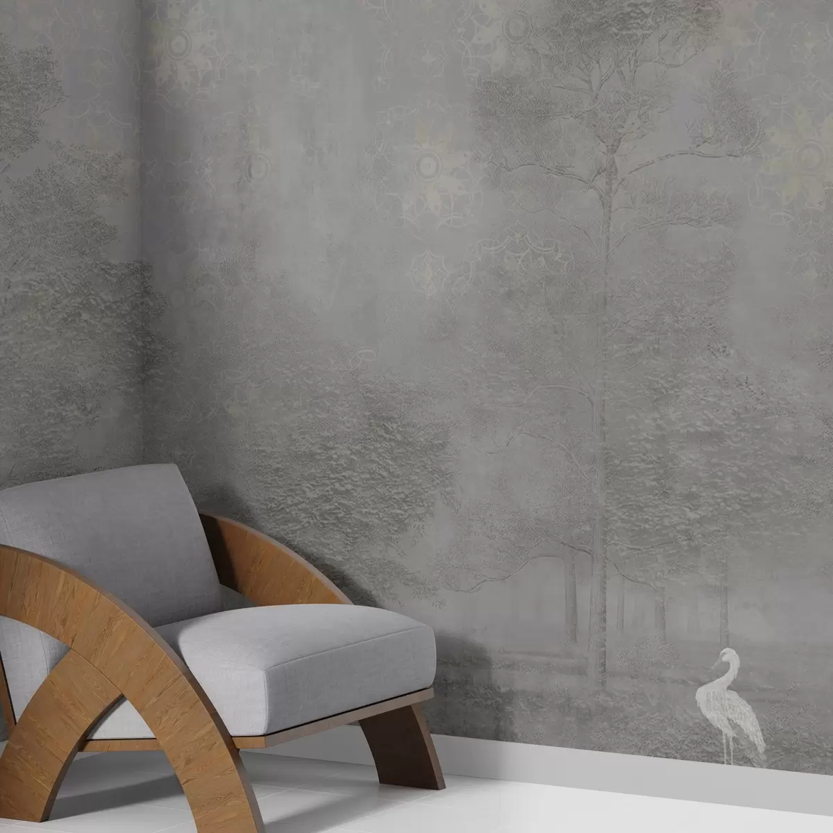 Fototapeter Lys, tåkete skog med en hegre i kule gråtoner Nr. w04953v2