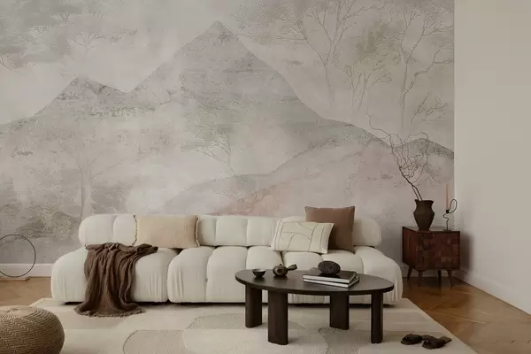 Fototapeter Myke pastellfargede fjell og trær i lett tåke Nr. w04954