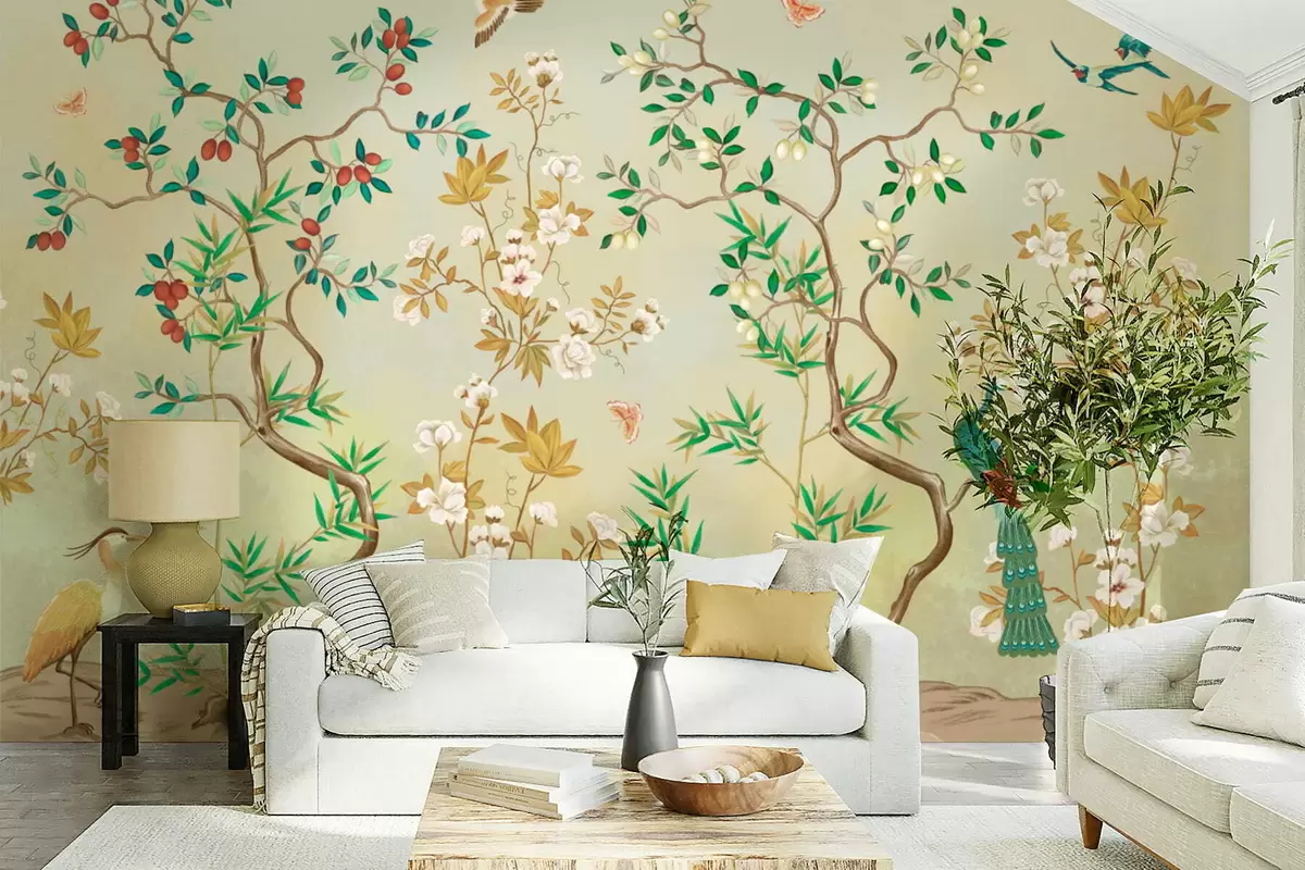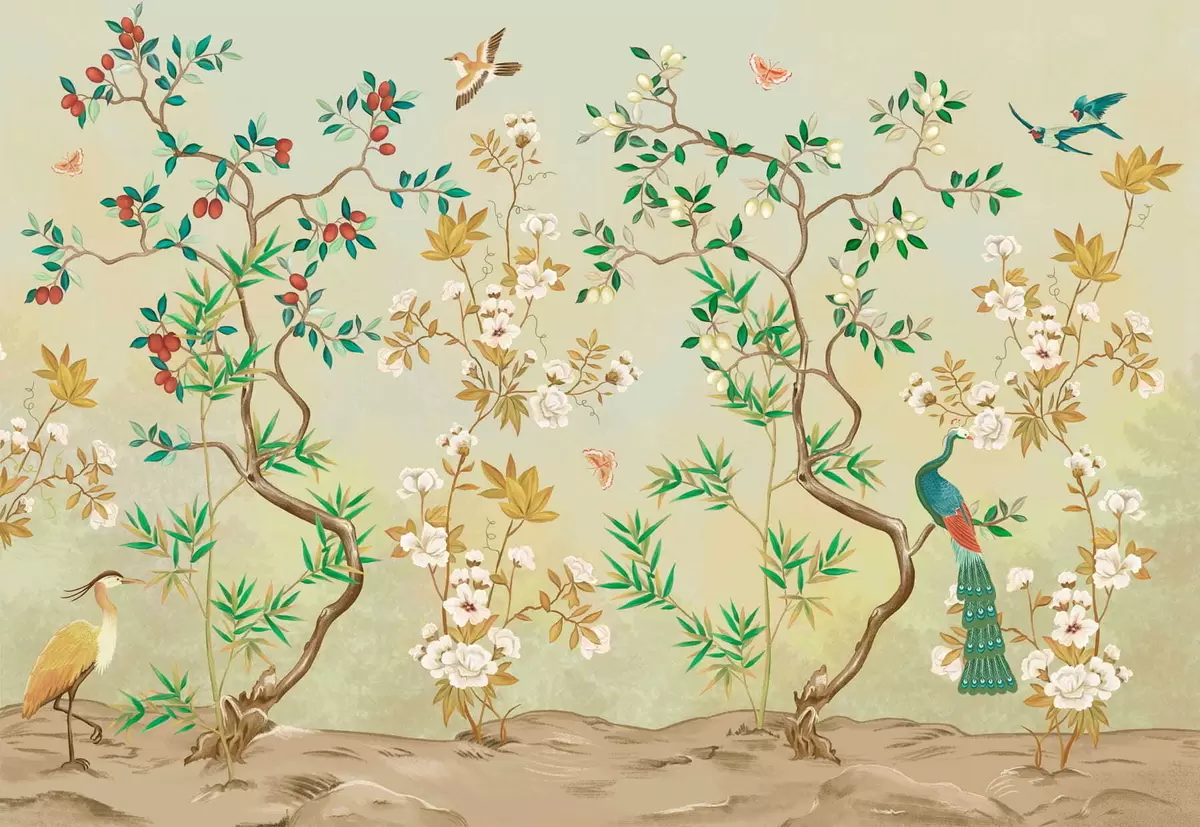 Fototapeter Scene med trær, blomster og fugler, lys bakgrunn Nr. w05004v1