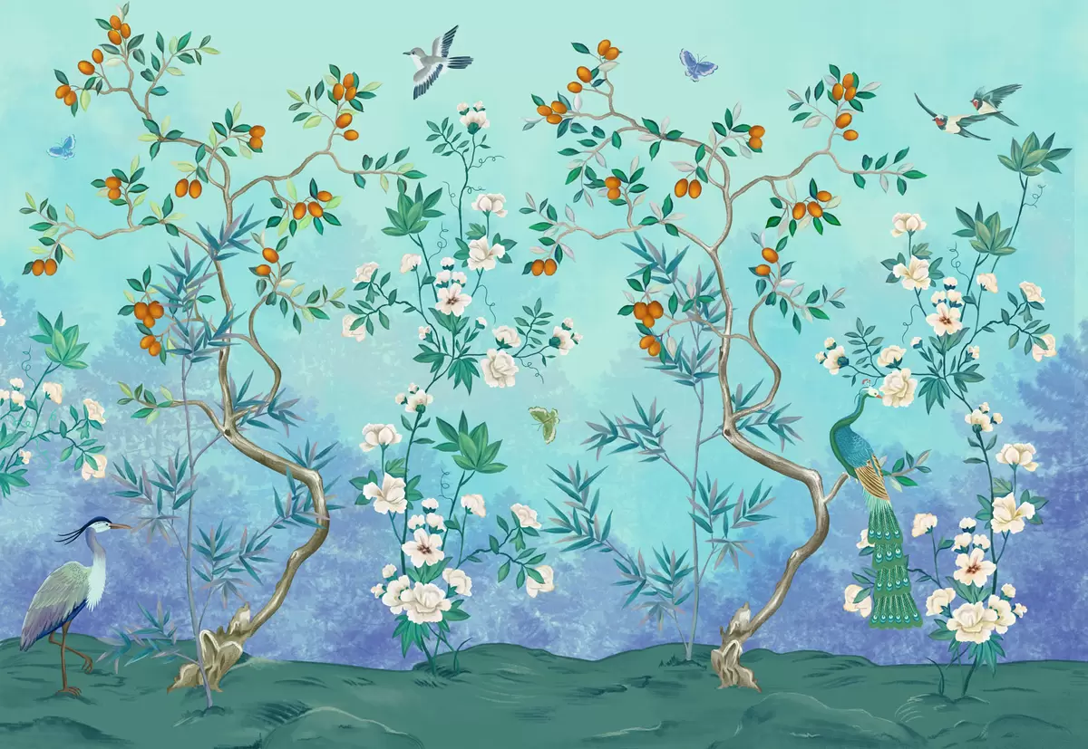 Fototapeter Scene med trær, blomster og fugler, blå bakgrunn Nr. w05004v2