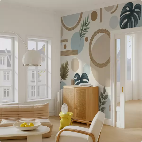 Fototapeter Geometrisk mønster med blader og sirkler i rolige farger Nr. w05018