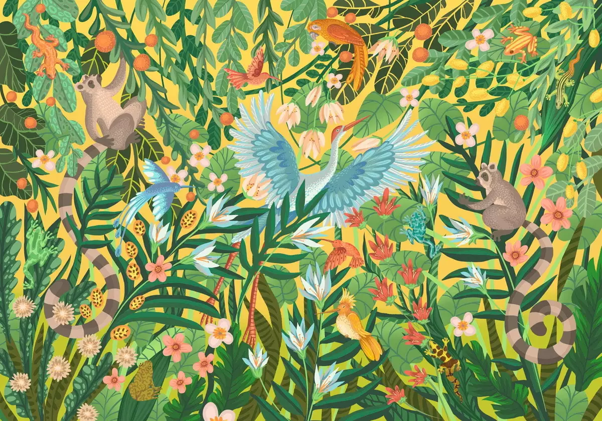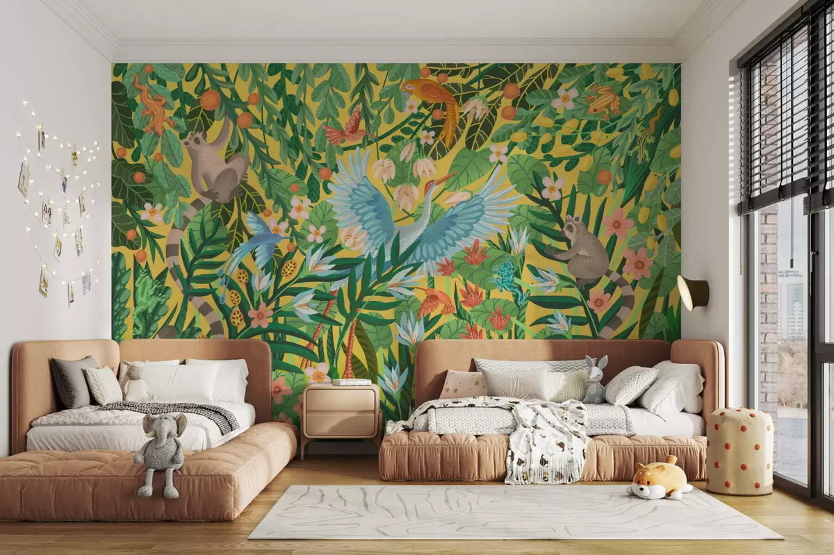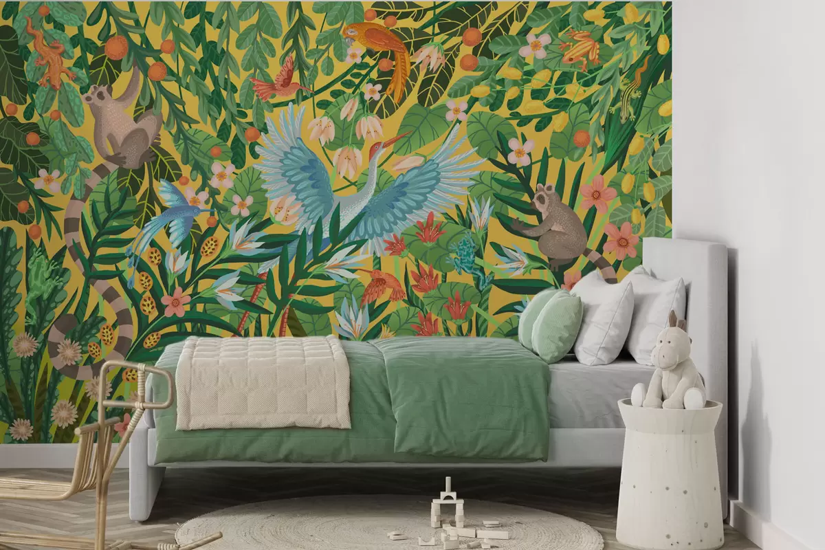 Fototapeter Lys scene med fugler og dyr i tett grøntområder Nr. w05024v1
