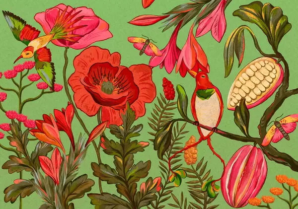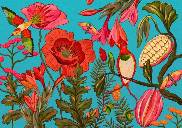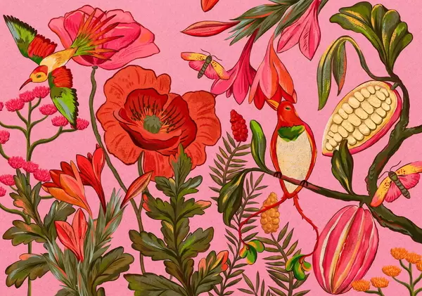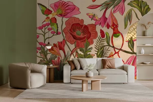 Fototapeter Dekorative blomster og fugler på beige bakgrunn Nr. w05036