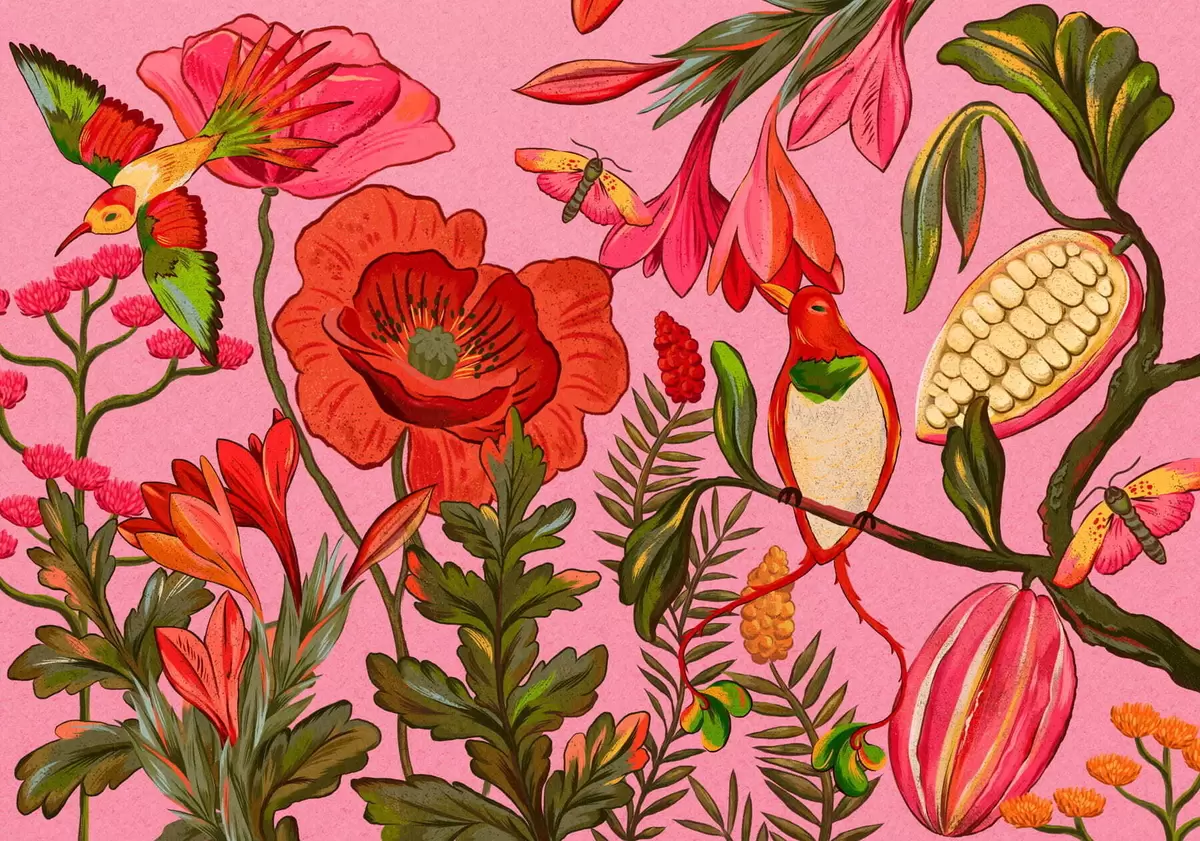 Fototapeter Dekorative blomster og fugler på rosa bakgrunn Nr. w05036v2