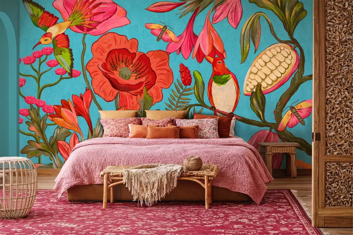 Fototapeter Dekorative blomster og fugler på blå bakgrunn Nr. w05036v3
